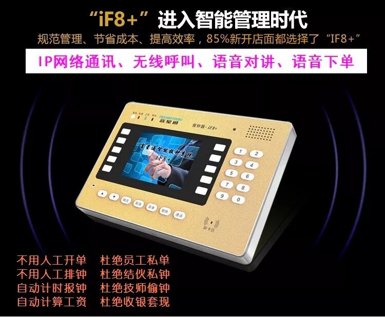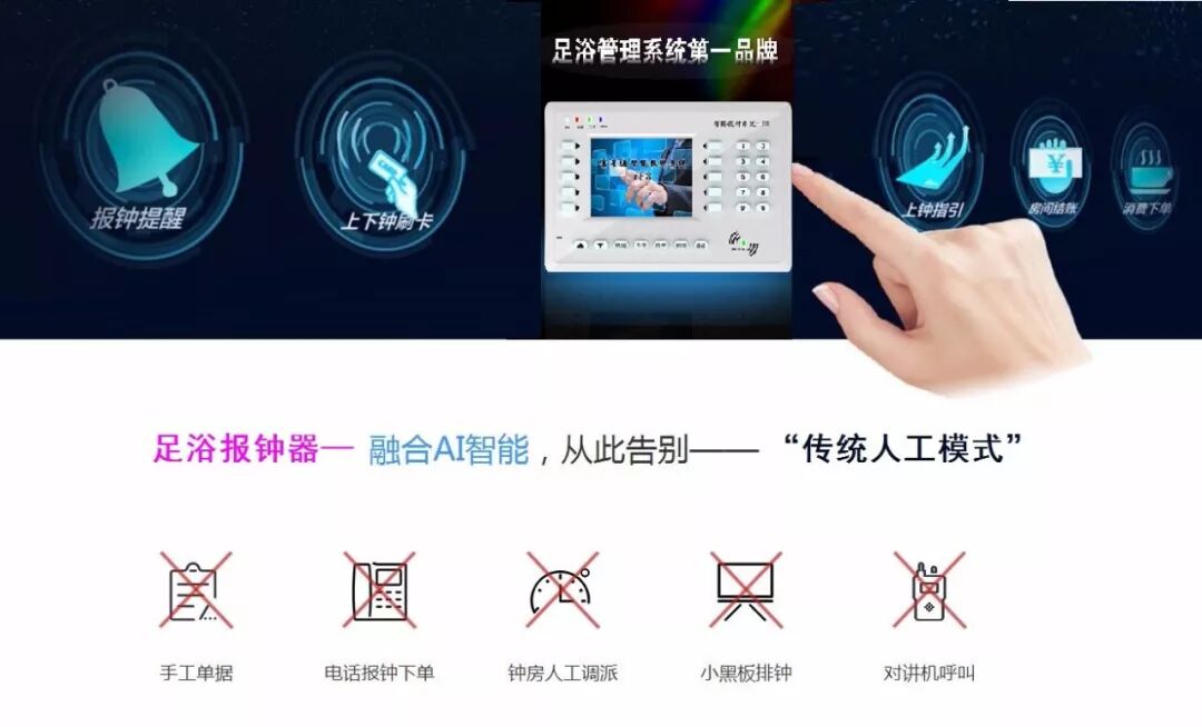3、在包房内报钟器上安排技师,技师在房内点单下单,换房,换项目,刷卡上/下钟,播报上钟时间,到钟提醒,预约提醒查询消费清单等