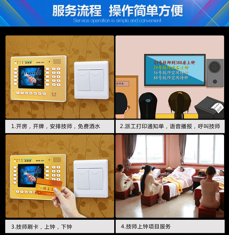富星通科技专业服务以足浴·足疗·水疗·桑拿·沐足·按摩·美容美发、棋牌、茶艺行业的“智能刷卡报钟器”设备,是提升软件公司单纯软件的优势卖点、提高软件品牌的竟争力、提高软件销售价格的好帮手!足浴报钟器产品的利润——是安防监控产品利润的300%!值得你的关注!!!为汇集广大聪慧的创业者提供商机!!!